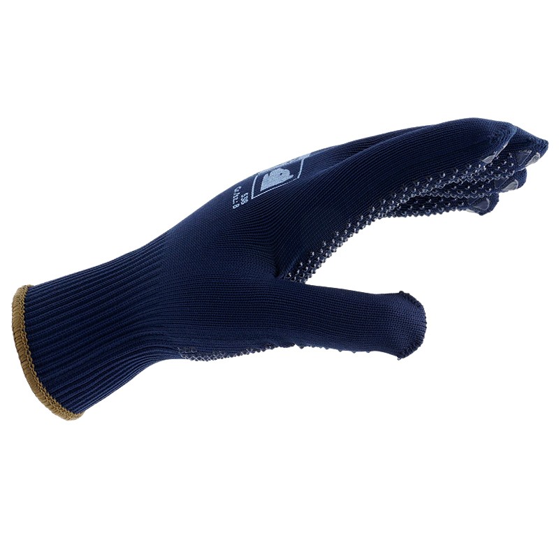 Baumwoll-Polyamid-Feinstrickhandschuh mit einseitig aufgebrachten blauen Vinyl-Noppen