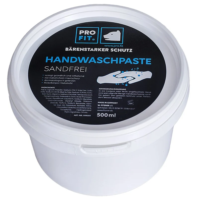 PRO FIT® Handwaschpaste, sandfrei, reinigt gründlich und schonend, mit natürlichem Hautschutz, dermatologisch getestet, Reibekörper: rundgeschliffenes Holzmehl, In die trockene oder leicht angefeuchtete Hand eine walnußgroße Menge Handwaschpaste geben. Den gelösten Schutz unter fließendem Wasser abspülen.