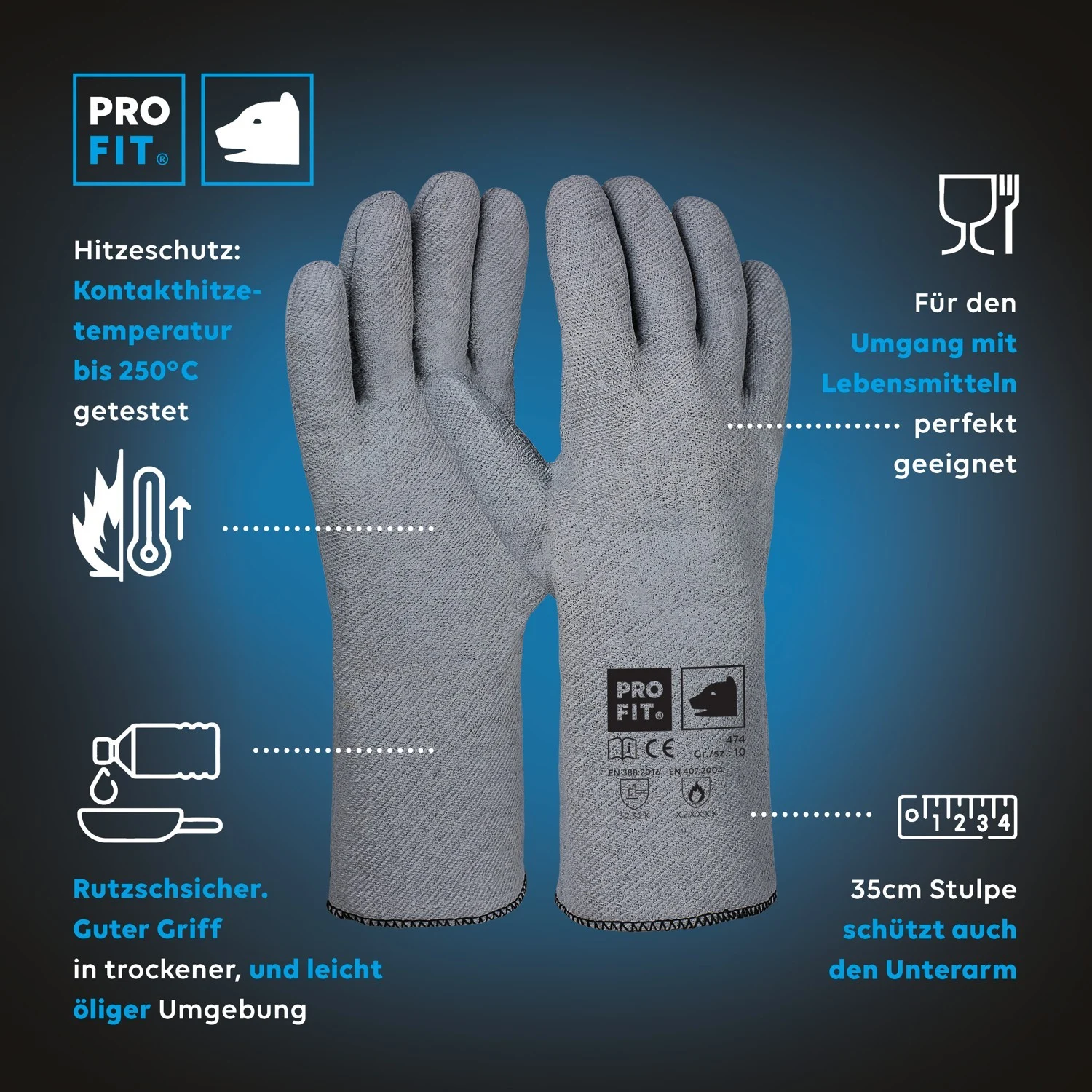 guter Tragekomfort, gute Passform, leichter Schnittschutz, sicherer Griff in trockener und leicht öliger Umgebung, sehr guter Hitzeschutz, empfohlene max. Kontakthitzetemperatur: 250°C, geeignet für Arbeiten mit warmen bis heißen Gegenständen